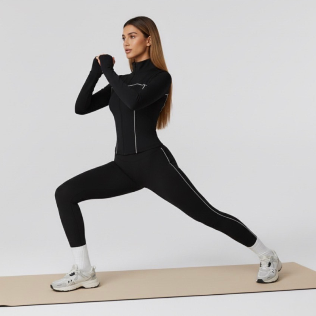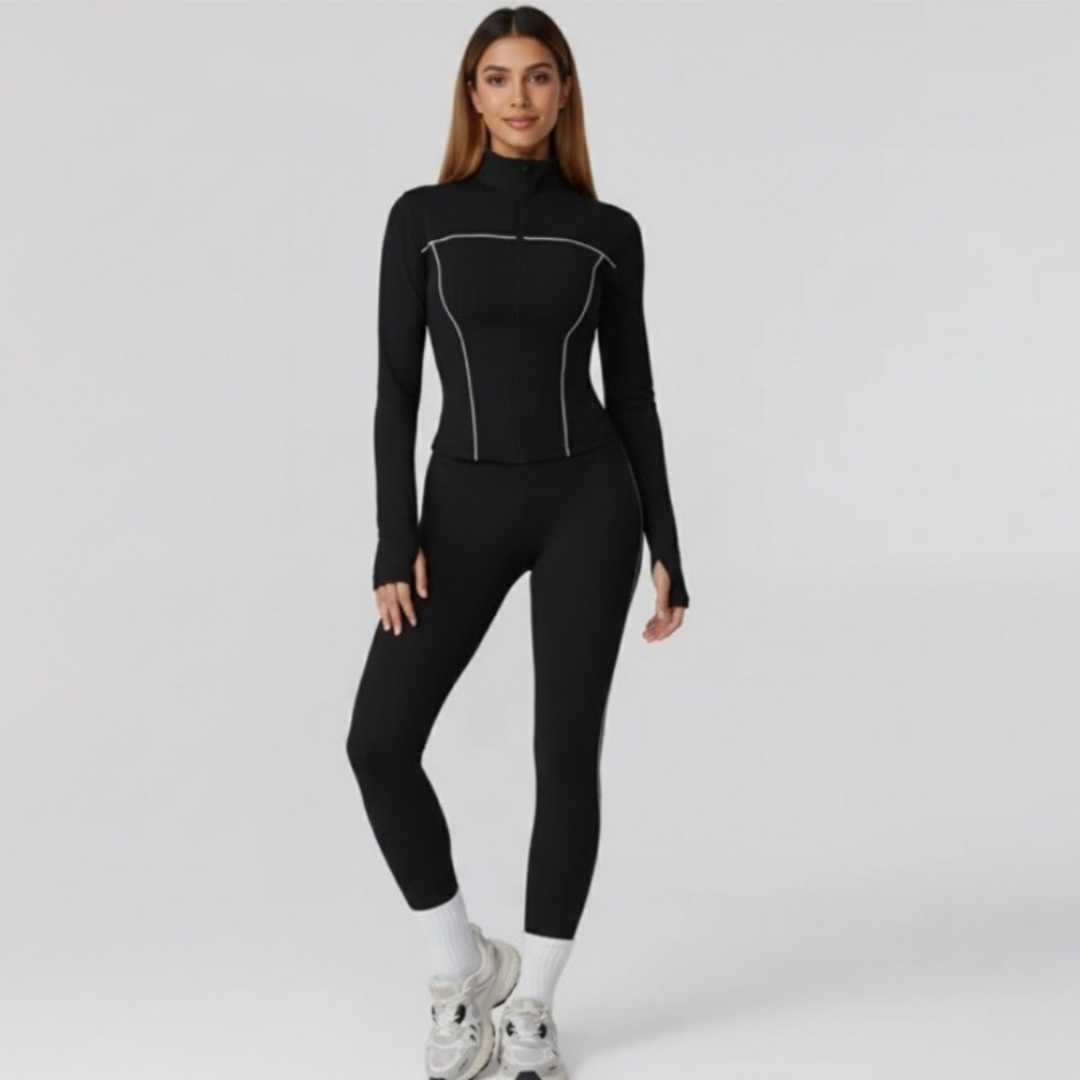 Discover the ultimate fusion of style, comfort, and functionality with the Soléa Set engineered for the modern active woman who demands both performance and elegance. This meticulously crafted two-piece set supports you through every lunge, stretch, and stride while keeping you effortlessly chic. Made from a premium spandex and nylon blend, the Soléa Set combines the smooth durability and breathability of nylon with the four-way stretch and shape retention of spandex. The result is a compression-like fit that sculpts, supports, and moves with your body without restriction that’s perfect for high-intensity workouts, yoga sessions, or simply powering through your day. Both the top and leggings feature a secure elastic waistband that stays comfortably in place, while the sleek, flattering cuts offer a second-skin feel and complete freedom of movement. Subtle accent lines elevate the design with a refined, athletic aesthetic, creating a clean, modern look that transitions seamlessly from the gym to casual outings.